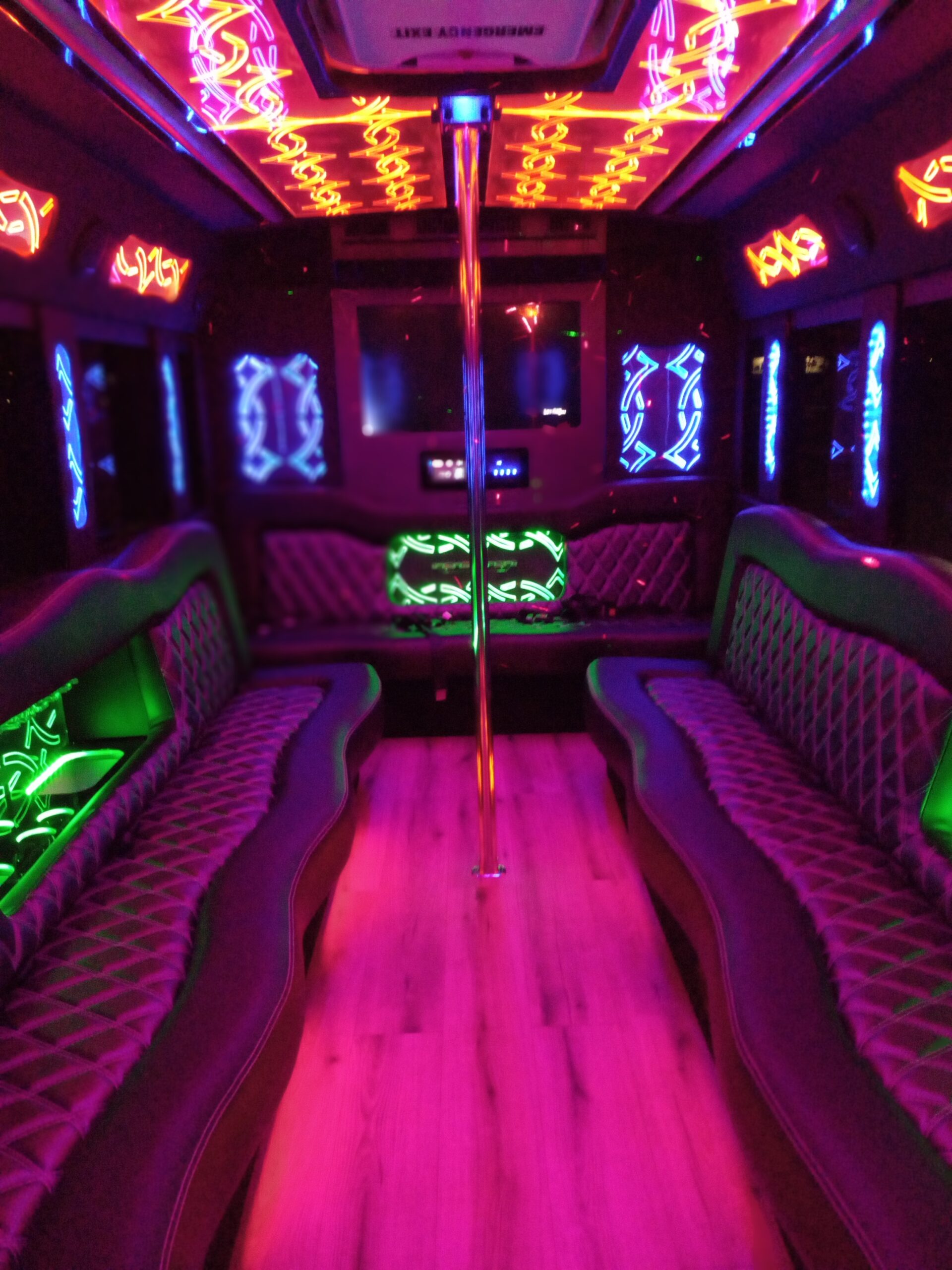 licensed chauffeurs, spotless interiors, and VIP amenities like LED lights, dance poles, surround sound, and